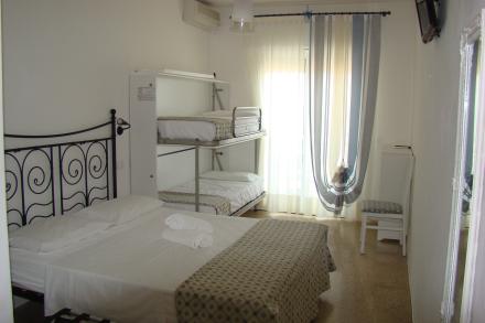 Chambre familiale avec salle de bains et grand balcon avec vue latérale sur la mer
